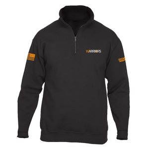 Warriors logo on the front of an ultra soft 1/2 zip sweatshirt. Oscar Mike logo printed on left sleeve and forward assaulting American flag printed on right sleeve.