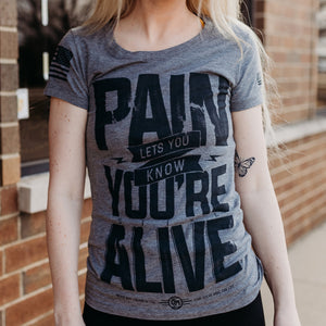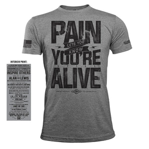 "Pain Let's You Know You Are Still Alive" printed on the front. Oscar Mike logo printed on left sleeve. Al Lewis' story printed on the INSIDE of the back.