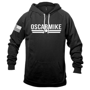 Our signature Oscar Mike logo printed on the front of a super soft, warm hoodie.  American Flag (assaulting) printed on the right sleeve.
