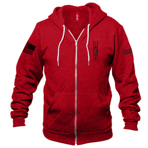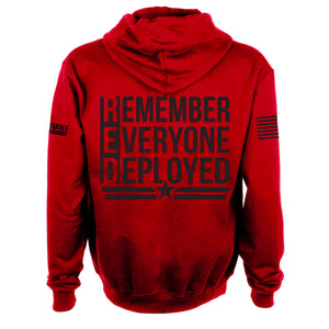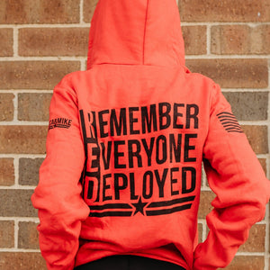 R.E.D. stands for Remember Everyone Deployed.  Help us spread the R.E.D. Friday movement by wearing R.E.D. gear every Friday...and don't forget to take a minute to remember and support our deployed military personnel while we are enjoying our freedoms stateside! Text on back of hoodie reads, "Remember Everyone Deployed" with the bottom half of the Oscar Mike logo.  Text on front left breast reads, "R.E.D." Vertically. American Flag (assaulting) printed on right sleeve. Oscar Mike sleeve on left sleeve.