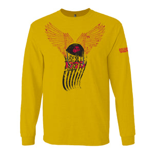 There is so much freedom and patriotism on display here: starting with the eagle's wings spread out like a shield protecting you (the wearer) and your family and the ones who matter most. The doughboy helmet of WWI is a 'tip of the hat' to honor the courage of our Marines in the face of adversity. And 1775 is the birth year of the formal unification under General Washington of what would become the United States Marine Corps. All of this symbology is tied together by the official USMC Eagle, Globe and Anchor prominently placed over a waving American flag representative of proud service to our Nation. But wait, there's more! This Oscar Mike design is made in the good ole US of A. That's right, 'Merican made by real 'Mericans with 'Merican grown cotton.