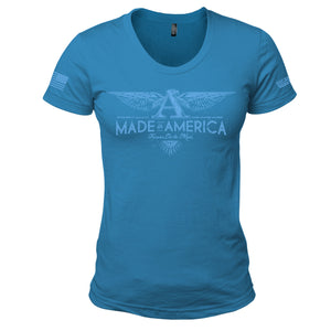 This ornate bald eagle design looks like it might belong on a vintage roadster's hood, but we thought it looks even better on a 100% American-made shirt. Hand crafted with pride!  Printed on the front of a light weight, ultra soft, women's cut tee. American Flag (assaulting) printed on right sleeve.  Oscar Mike Logo printed on left sleeve.