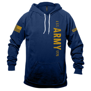 The new U.S. Army (Officially Licensed)-Vertical vintage print is the perfect pullover hoodie designed to show off your Army Pride. Don't let the cool weather break your PT routine! This 100% American Made hoodie on a dark-blue pullover will keep you Oscar Mike to take on the elements, your workout, or to just show your military support!