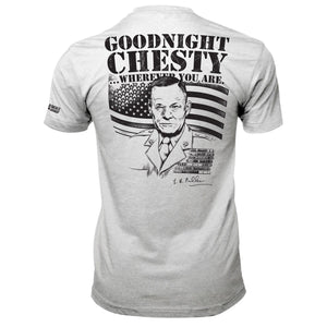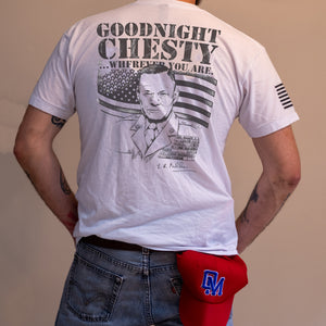 Chesty Puller. The legend. The genuine, grade-A bad ass of a human being who was more decorated than anyone else in the history of the United States Marine Corps (USMC) looks down on us while we sleep, ensuring our freedom remains sacred. Goodnight Chesty... wherever you are. Semper Fidelis! 'Goodnight Chesty' Graphic on back. Chesty Puller signature on right breast.