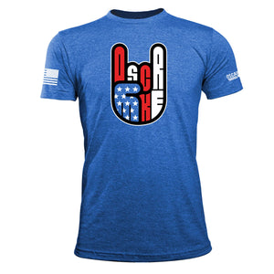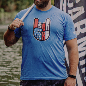 A hand gesture we throw up, without even thinking, when we’re taken over by a rock song or something surprisingly rad. Whether you’re at a concert or in your boxers rocking out in the living room. America Rocks and so do you…this American-Made t-shirt is a tribute to both of you. American Flag (assaulting) printed on right sleeve. Oscar Mike Logo printed on left sleeve.