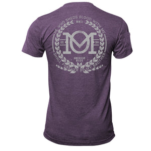 After challenging our dye shop to produce a new color welcoming spring - Heather Sangria - we then turned to the OM Design Department and challenged them to create their magnum opus; a design memorializing the countless lives of the brave women and men who've fought to defend this great country. Printed on the back of this 100% American Made tee is Shakespeare's "He who sheds blood with me shall forever be my brother" encircling the original OM stacked logo and crest. A simple but elegant nod to honor all the Heroes we've lost in the pursuit of our liberty and independence.