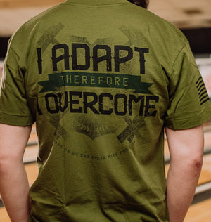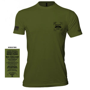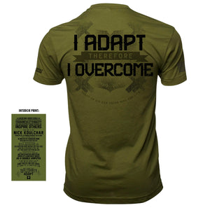 "I Adapt Therefore I Overcome" printed on the back of a lightweight, ultra soft tee. "Adapt or Die" printed on front left breast. American Flag (assaulting) printed on right sleeve. Oscar Mike logo printed on left sleeve. Nick Koulchar's story printed on the INSIDE of the back.