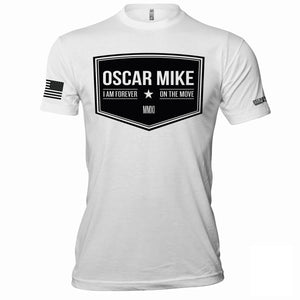 The original Oscar Mike badge emblazoned with our motto and MMXI signifying the year of our establishment. American Flag (assaulting) printed on right sleeve. Oscar Mike logo printed on left sleeve.
