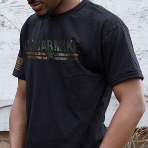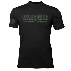 The Oscar Mike logo with awesome variations of camouflage fill printed on the front of a lightweight, ultra soft, men's cut tee. This tee also sports an American Flag (assaulting) printed on the right sleeve.