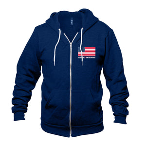 Simple, clean, straight to the point. Full color American Flag design on front. Writing under flag reads “Oscar Mike * American Made.”