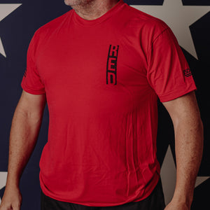 R.E.D. stands for Remember Everyone Deployed.  Help us spread the R.E.D. Friday movement by wearing R.E.D. gear every Friday...and don't forget to take a minute to remember and support our deployed military personnel while we are enjoying our freedoms stateside! Text on back of shirt reads, "Remember Everyone Deployed" with the bottom half of the Oscar Mike logo.  Text on front left breast reads, "R.E.D." Vertically. American Flag (assaulting) printed on right sleeve. Oscar Mike sleeve on left sleeve.