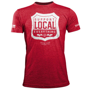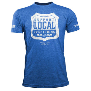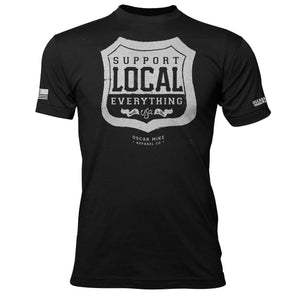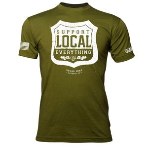 Our Support Local Everything crest printed front of a lightweight, ultra soft tee! This one will show everyone around that you support local business and most especially, American-made! American Flag (assaulting) printed on right sleeve. Oscar Mike Logo printed on left sleeve. OM Shield printed high on the back.
