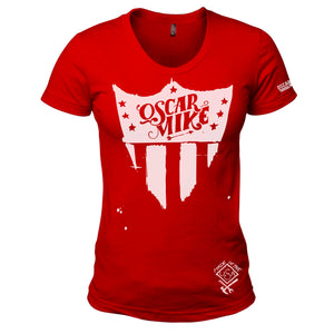 A throwback to a golden age of hand-painted signs and labels along the American crossroads, where the imperfections are what make 'em perfect. Features an "Oscar Mike" shield on the chest and "Made In the USA" badge printed on the bottom left corner of a lightweight, ultra soft, women's cut shirt. Oscar Mike logo printed on left sleeve.