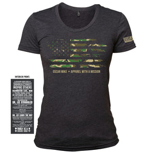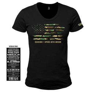 Distressed camouflage American Flag design with text reading, "Oscar Mike, Apparel With A Mission" printed on front. Oscar Mike logo printed on left sleeve.