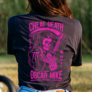 Simultaneously terrify and educate anyone standing behind you. Whether you’re waiting for a smoothie, volunteering at an Oscar Mike Clinic, or addressing the judge in court, the limited edition CHEAT DEATH tee can do it all.