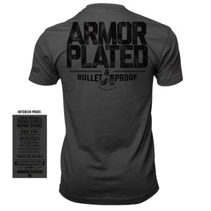 "Armor Plated & Bullet Proof" Written in black on the back of a lightweight, ultra soft shirt. OM stencil logo on the front chest. American Flag (assaulting) printed on right sleeve. Oscar Mike logo printed on left sleeve.