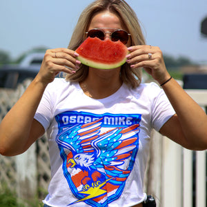 What's more American than a red, white, and blue, star studded eagle ripping through the sky while riding a lightning bolt?! We couldn't think of anything so we present to you our Ride the Lightning tee! We opted for a four color print on our ultra soft white tees. Show your American pride by rocking this one.